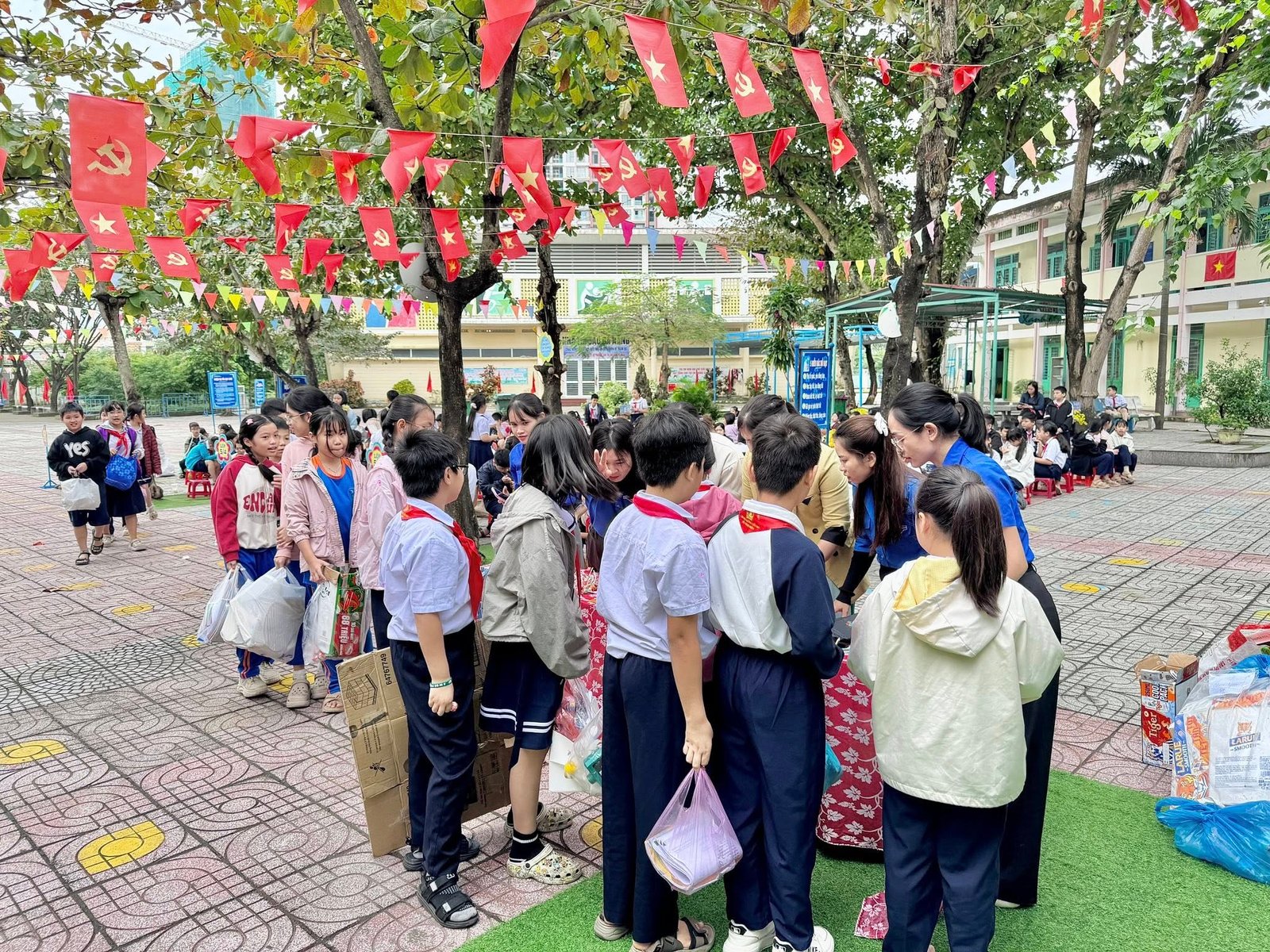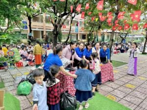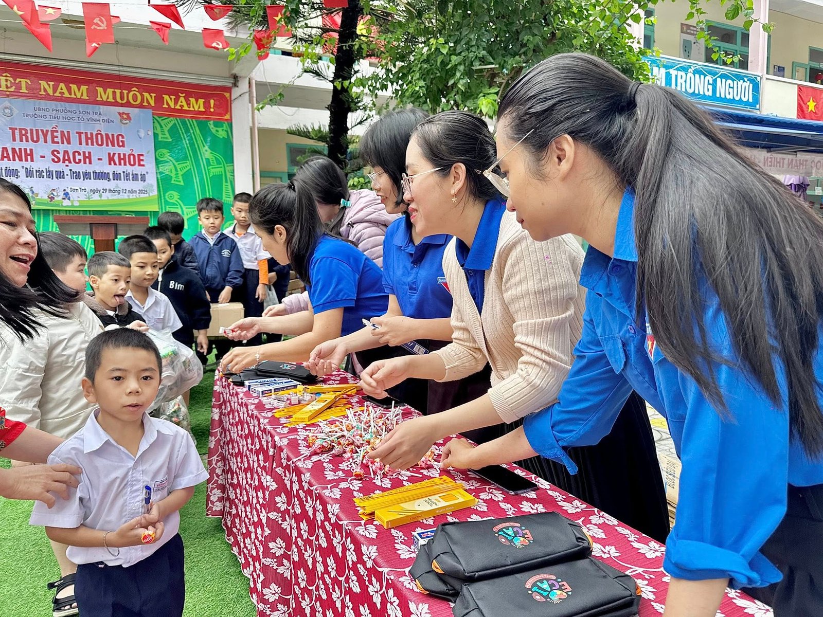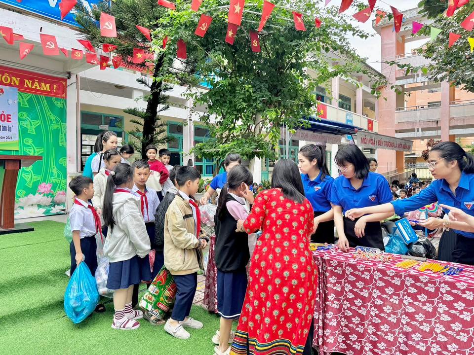 Học sinh mang rác tái chế như giấy vụn, chai nhựa, lon nhôm để đổi quà. Hoạt động góp phần giáo dục ý thức phân loại rác, bảo vệ môi trường, hình thành lối sống xanh, tinh thần tiết kiệm, sẻ chia.