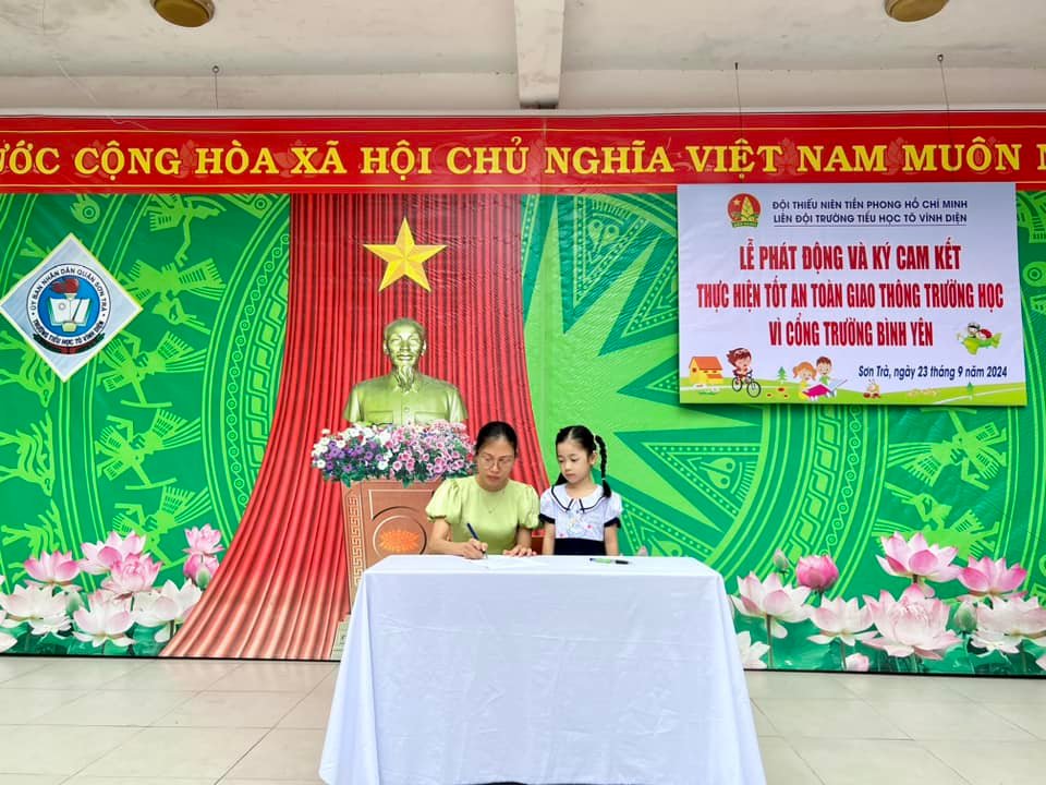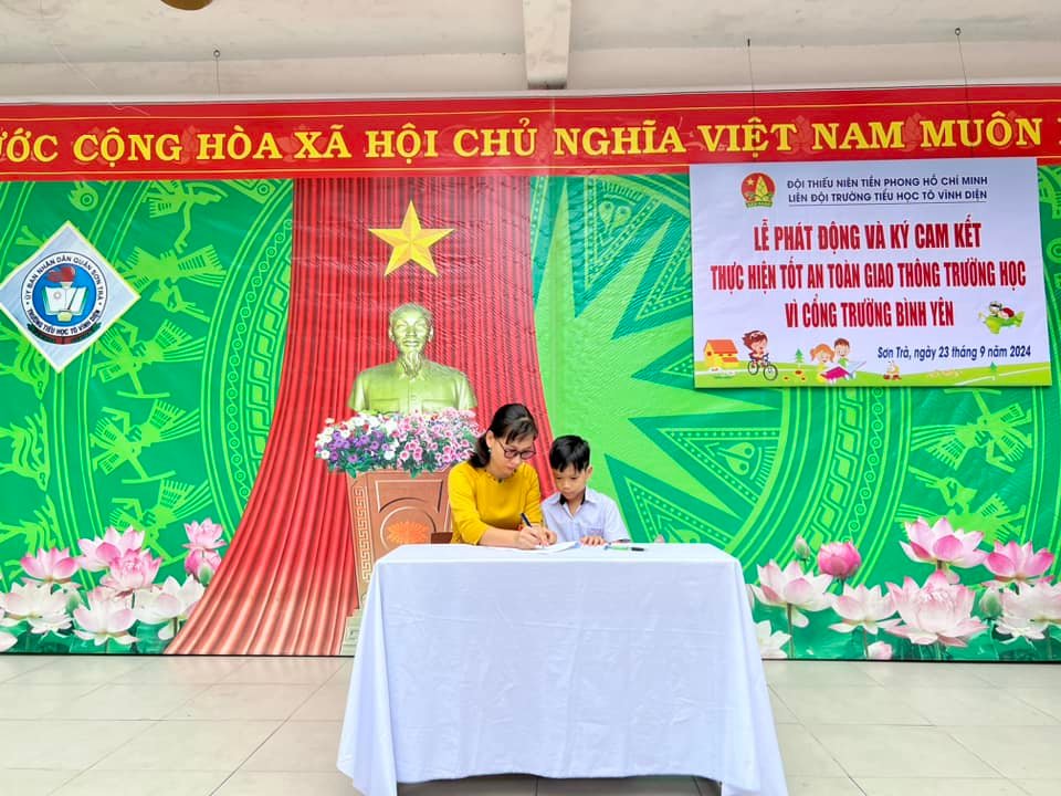 Thực hiện chương trình năm học 2024 – 2025. Sáng 23-9, Liên đội trường TH Tô Vĩnh Diện tổ chức Lễ phát động và Ký cam kết thực hiện tốt ATGT trường học – Vì cổng trường bình yên. Về dự có đồng chí Đại úy Trần Tiến – đội cảnh sát giao thông trật tự quận Sơn Trà; cô giáo Đặng Thị Hiền – Hiệu trưởng nhà trường cùng toàn thể CBGVNV và học sinh toàn trường.